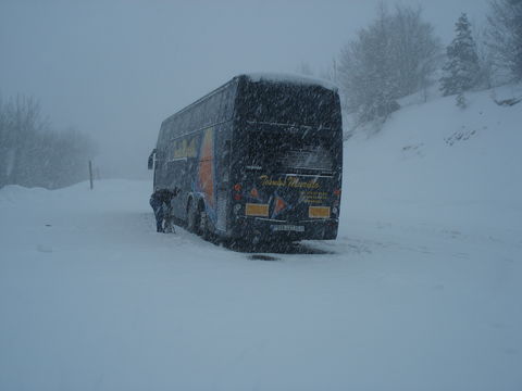En vista de las circunstancias, decidimos poner las cadenas al autobús. Yo, que no se las he puesto en mi vida a un coche, me estreno con un pedazo autobús.